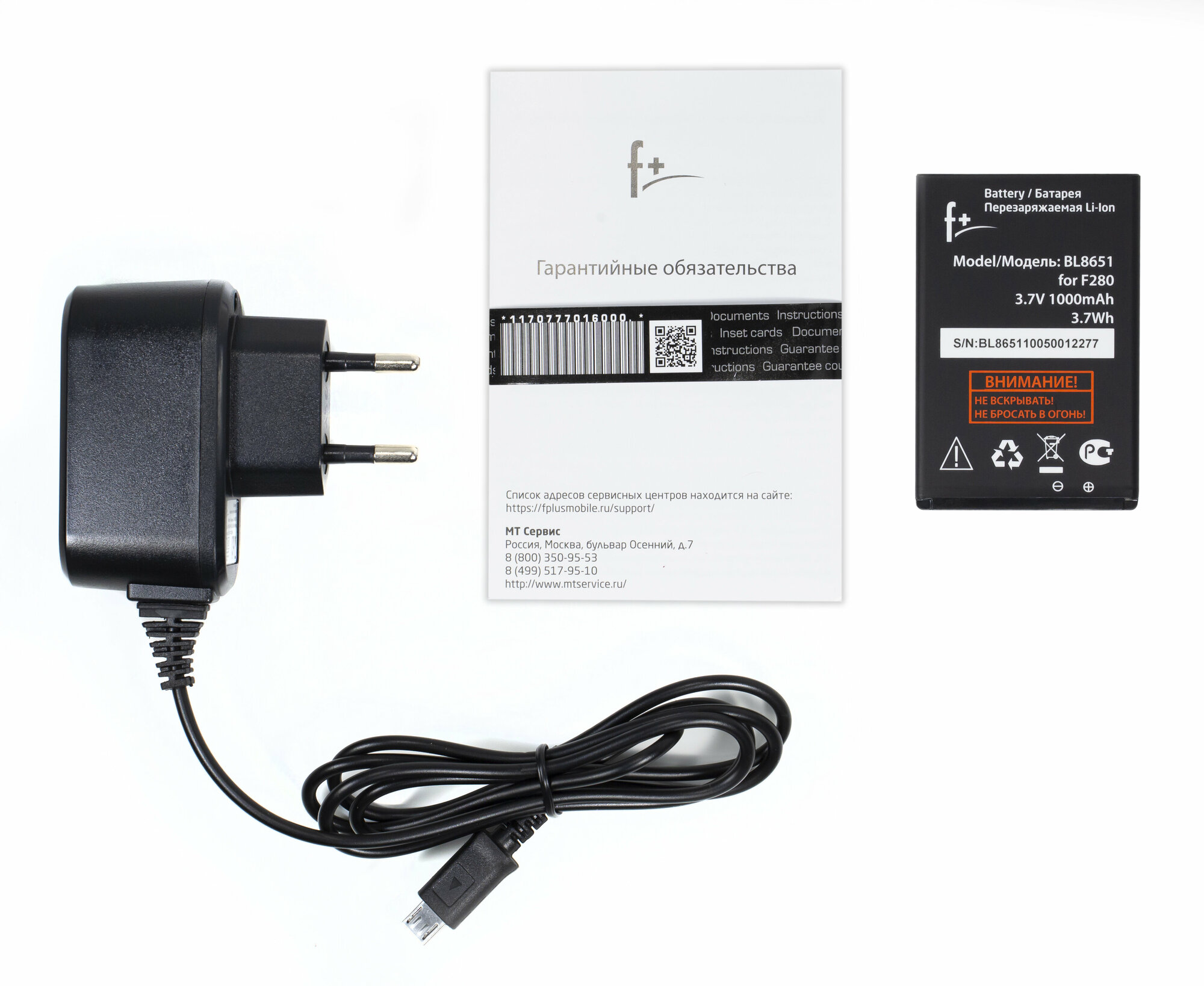 F+ F280 phone, battery, charger, user manual, warranty card