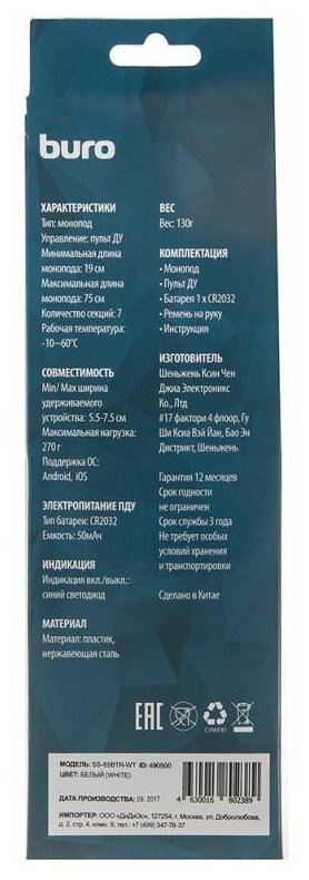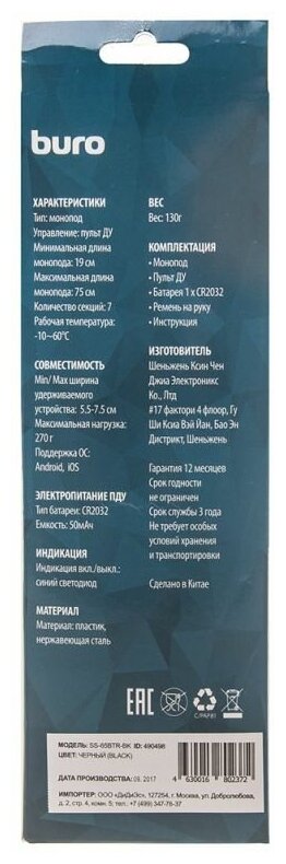 Monopod for selfie, bluetooth, maximum length 750 mm, weight 130 g