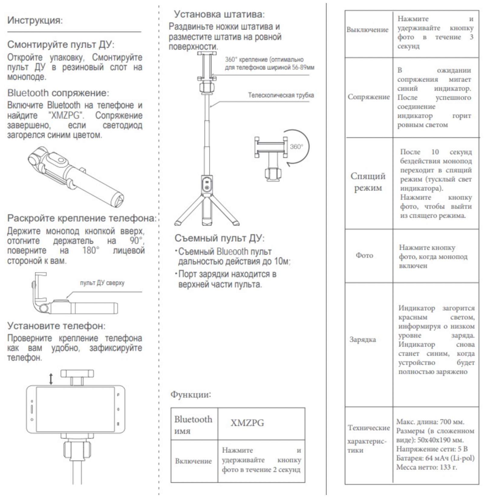 Description: Tripod/monopod, bluetooth, maximum length 420 mm, weight 155 g