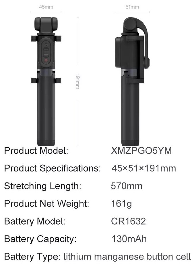 Xiaomi Monopod, Selfie Stick with Bluetooth Button, Monopod Tripod for Smartphone with Screen Width 56 - 89mm Black