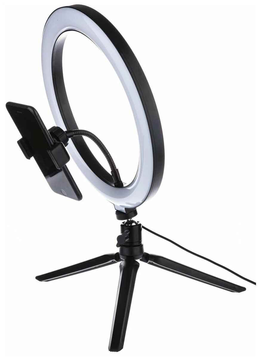 Contents: Ring lamp - 1 pc. Bluetooth remote control - 1 piece. Phone holder - 1 pc. Metal ball head - 1 pc. Table tripod - 1 pc.
