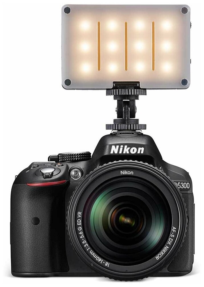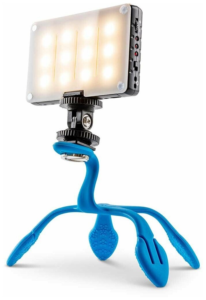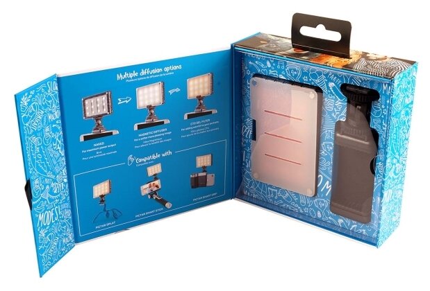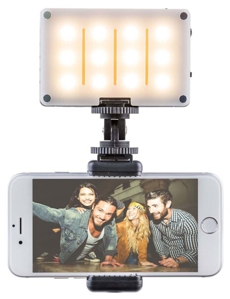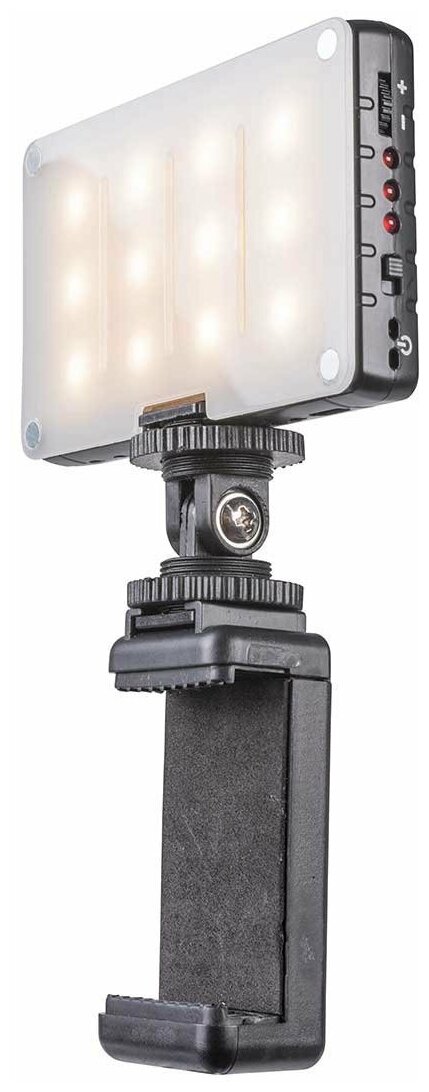 Illumination 900 lux at a distance of 1 m; stable color temperature 5600 K; USB rechargeable Li-on battery; 120 minutes of operation at full power; two filters: diffuse and correction; lighting angle 120 degrees; float