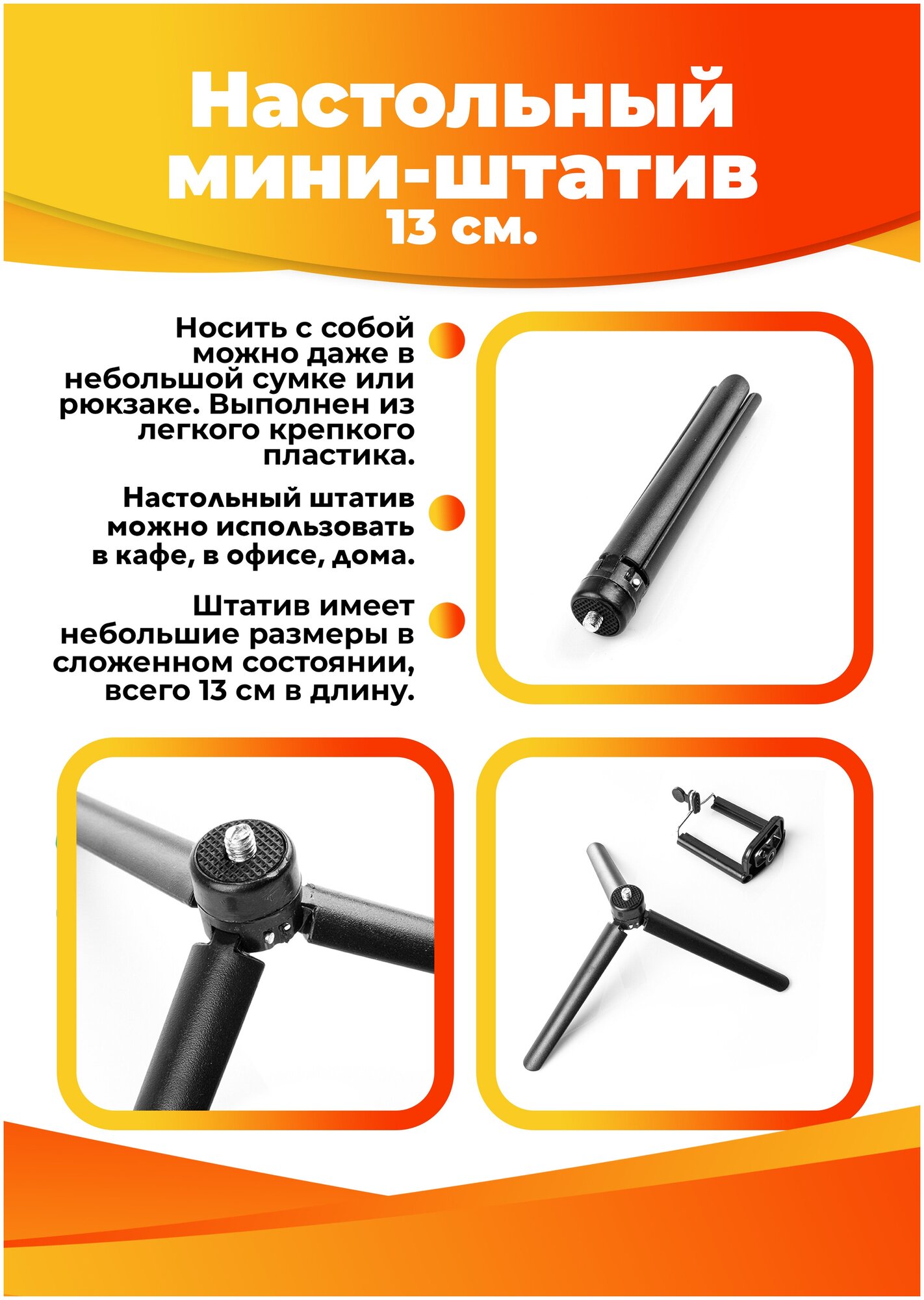 Tripod type: tabletop, design: tripod, scope of application: for photo and video cameras, smartphones, maximum shooting height: 13 cm, head type: no, options and kit: removable head