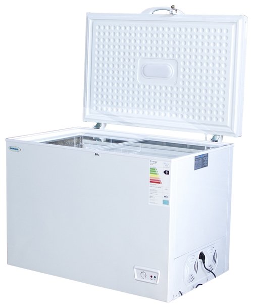 Freezer type: chest, defrosting: manual, total volume: 328 l, height: 84.50 cm, width: 108 cm, depth: 75 cm, energy class: B, case color: white, control type: electromechanical, super freezing, power for