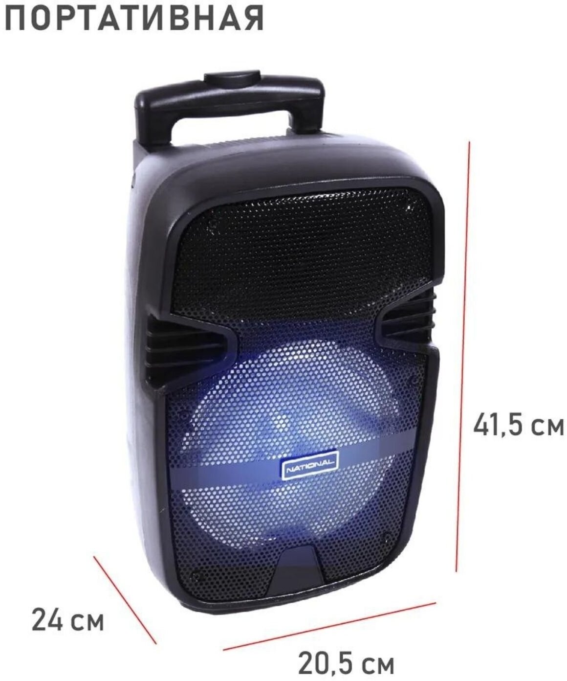 Tweeter/midrange driver diameter 38.1 mm; backlight; karaoke function; adjustment of the echo effect of the microphone channel; microphone input