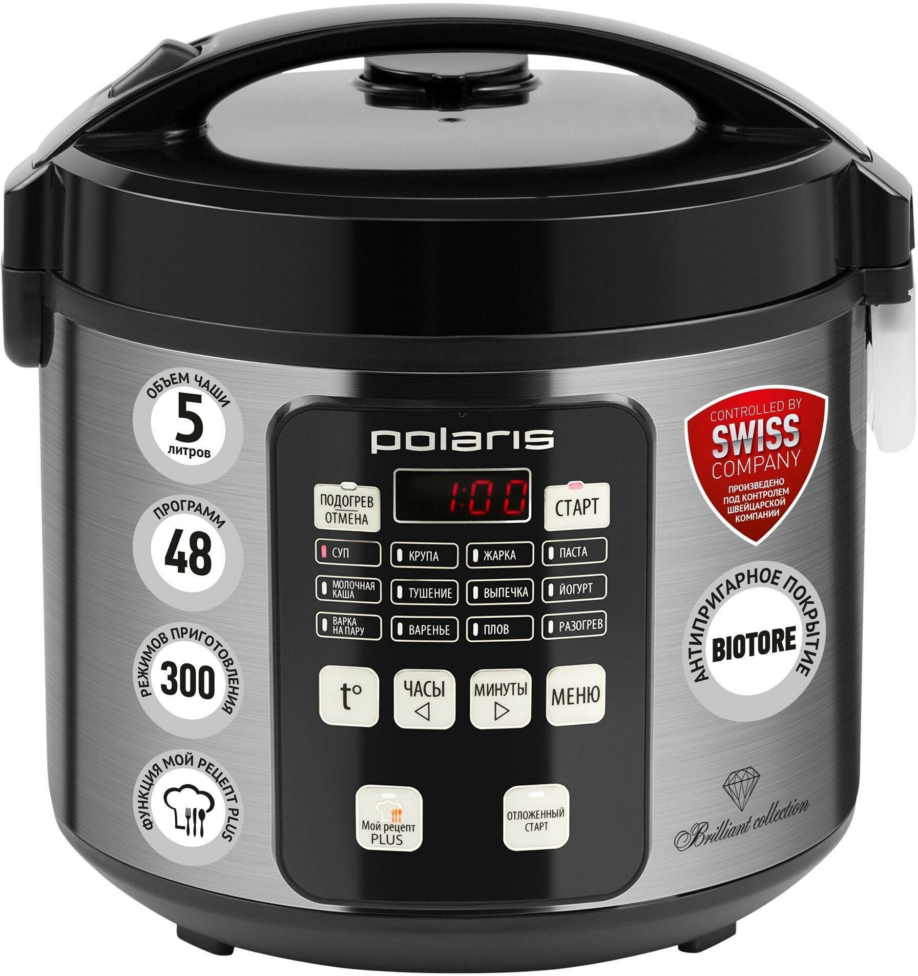Type: multicooker, volume: 5 l, cooking programs: baking, frying, roasting, yogurt, cereal, milk porridge, pasta, dumplings, pizza, pilaf, soup, stewing, jellied meat, steaming, casserole, heating, your own recipe, sauté, sterilized