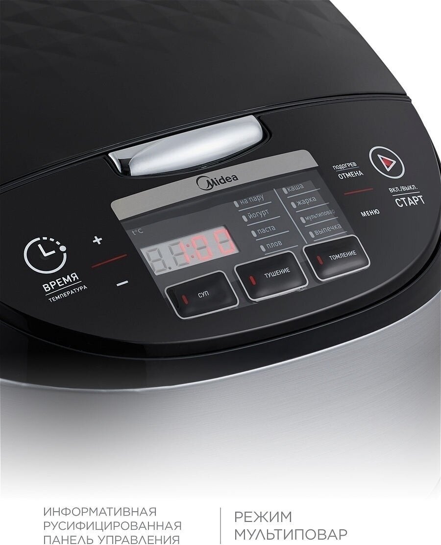 Type: multicooker, volume: 5 l, cooking programs: baking, frying, roasting, yogurt, cereal, milk porridge, pasta, dumplings, pizza, pilaf, soup, stewing, jellied meat, steaming, casserole, heating, your own recipe, sauté, sterilized