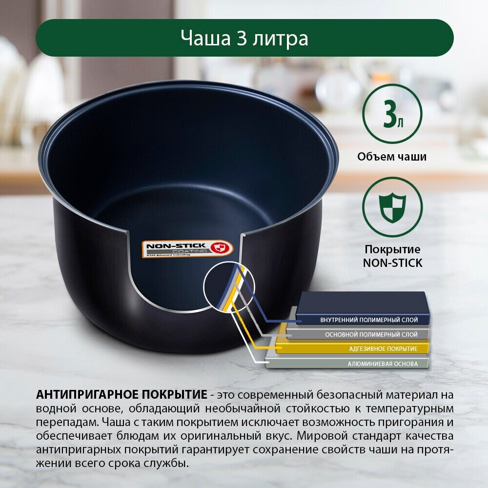 Type: multicooker, volume: 3 l, cooking programs: jam, boiling, baking, frying, baking, yogurt, smoking, cereals, milk porridge, multicooker, pasta, pilaf, steaming, soup, cottage cheese, stewing, jellied meat, fermentation