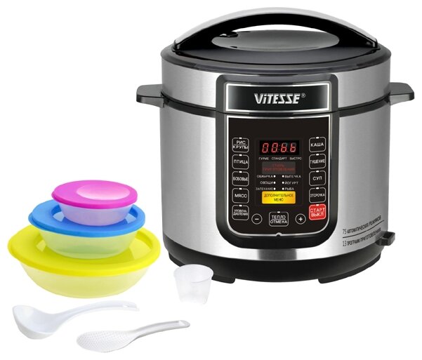 Type: multicooker, volume: 5 l, cooking programs: baking, frying, roasting, yogurt, cereal, milk porridge, pasta, dumplings, pizza, pilaf, soup, stewing, jellied meat, steaming, casserole, heating, your own recipe, sauté, sterilized