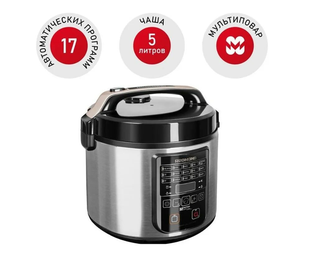 Type: multicooker, volume: 5 l, cooking programs: boiling, baking, frying, baking, yogurt, cereal, milk porridge, multicooker, pasta, pizza, pilaf, steaming, soup, stewing, Delayed start, Keep warm
