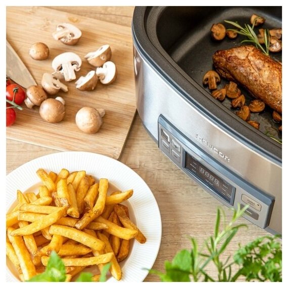 Display, cooking time adjustment, temperature adjustment, removable top lid, bowl with handles