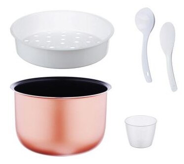 Equipment: carrying handle, moisture collector, thermally insulated body, removable steam valve, rice spoon, measuring cup, soup spoon, steam basket