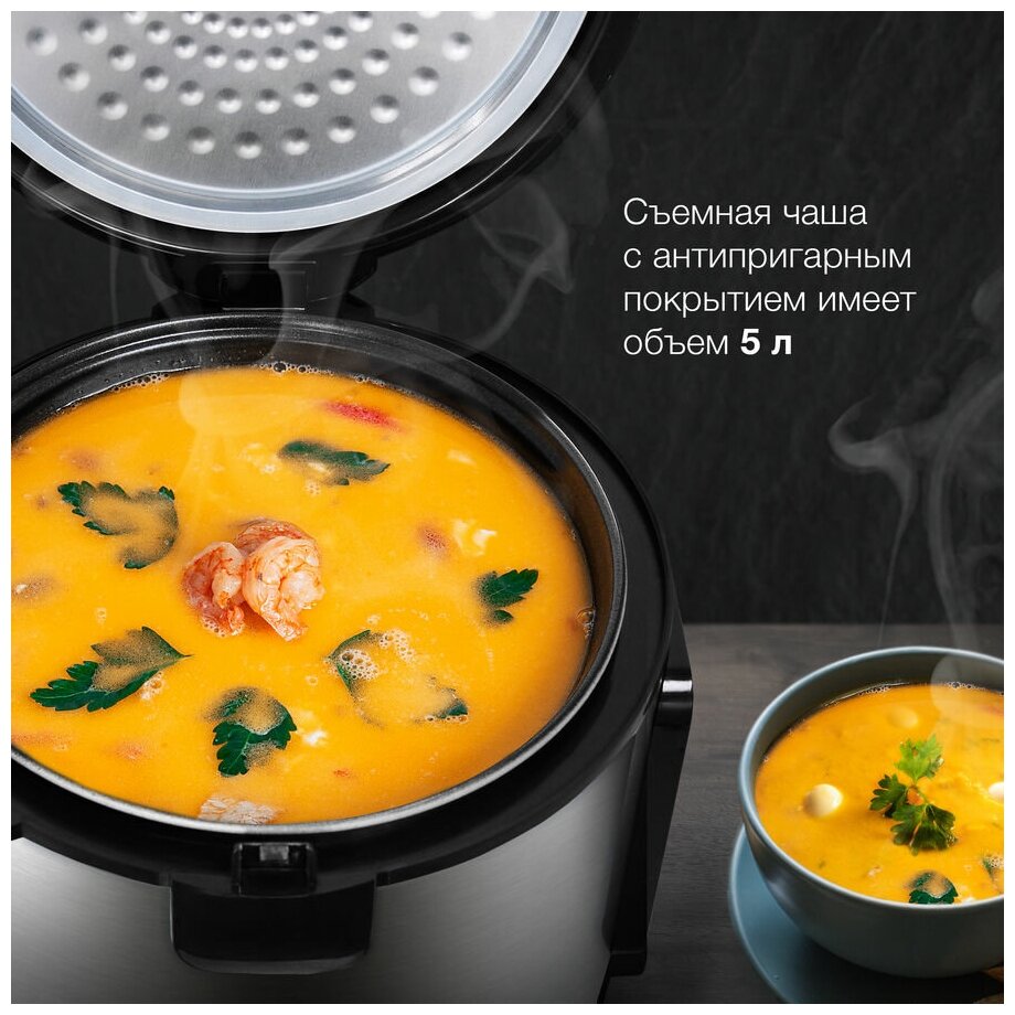 Type: multicooker, volume: 5 l, cooking programs: baking, frying, roasting, yogurt, cereal, milk porridge, pasta, dumplings, pizza, pilaf, soup, stewing, jellied meat, steaming, casserole, heating, your own recipe, sauté, sterilized