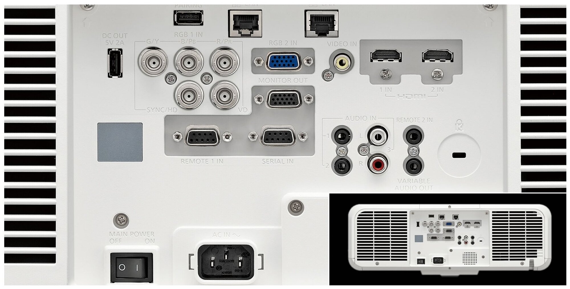 Ethernet, RS-232, USB Type-A x 2, HDMI input x 2, RGB input, VGA input, RCA audio input, mini jack 3.5 mm audio input, composite video input