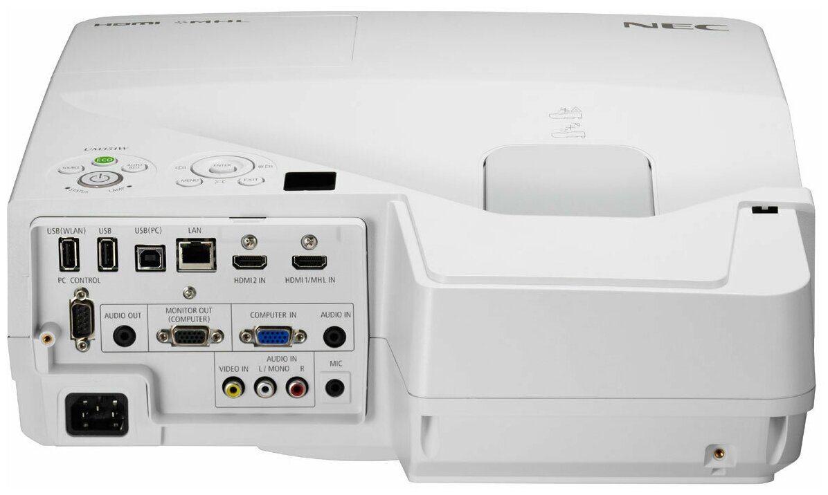 Ethernet, RS-232, USB Type-A x 2, USB Type-B, HDMI input x 2, VGA input, RCA audio input, mini jack 3.5 mm audio input, composite video input
