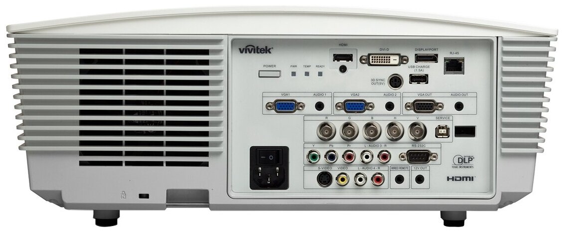 Ethernet, RS-232, USB Type-A, USB Type-B, HDMI input, RGB input, S-Video input, VGA input x 2, RCA audio input x 2, mini jack 3.5 mm audio input, composite video input, input video component