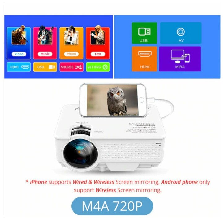 Purpose: for home cinema, projector resolution: 800x480, max. diagonal image size: up to 5 m, luminous flux: 2000-4000 lm, contrast: 1000:1-3000:1, technology: LCD, wireless communication: Wi-Fi, connectors and interfaces: