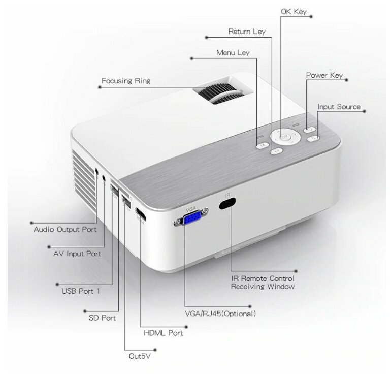 Purpose: for home cinema, projector resolution: 800x600, max. diagonal image size: up to 5 m, luminous flux: 1000-2000 lm, contrast: 1000:1-3000:1, technology: LCD, connectors and interfaces: USB Type-A, HDMI input, VGA input, in