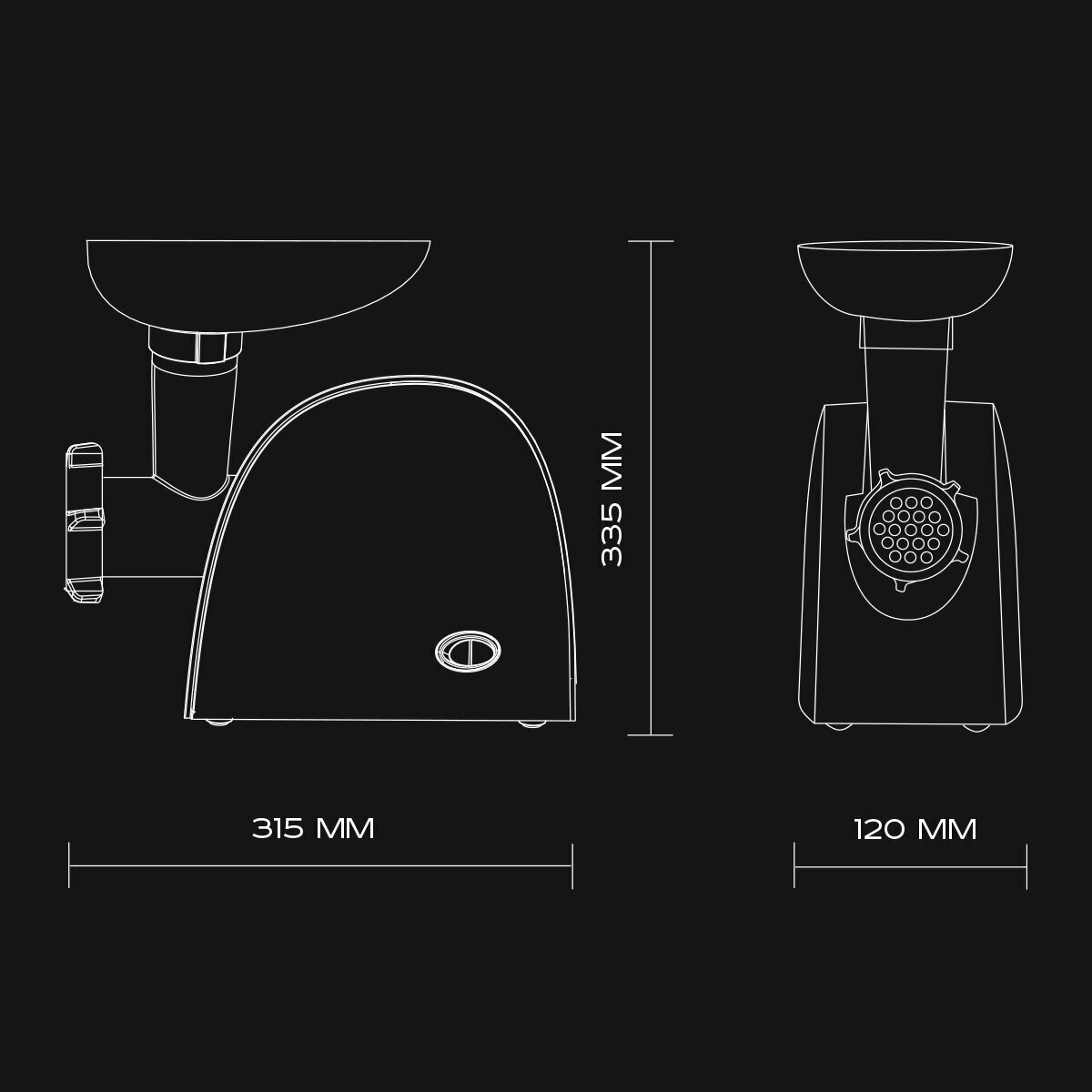 Set includes 6 attachments: 2 perforated grates with holes 5 and 7 mm, attachments for kebbe and for making homemade sausage, a vegetable cutter with a coarse grater and a shredder