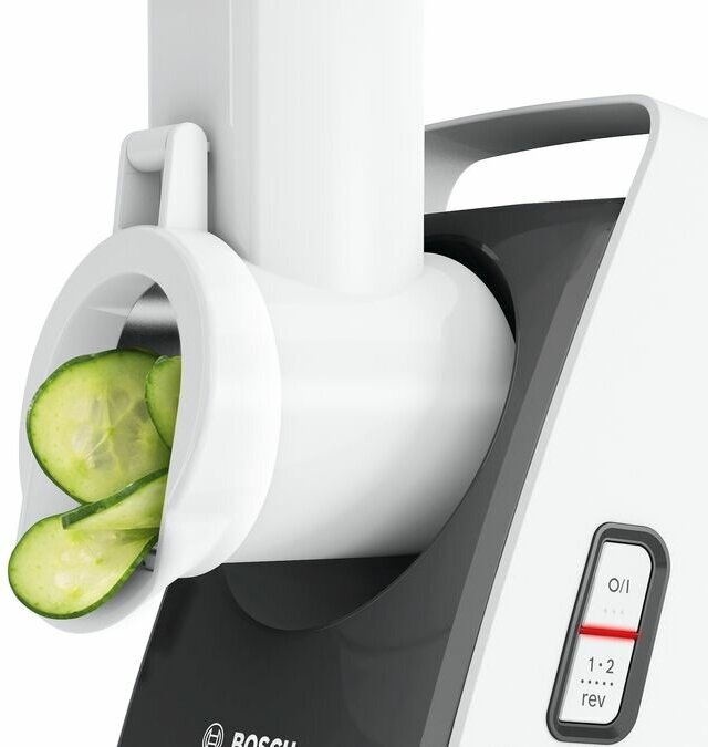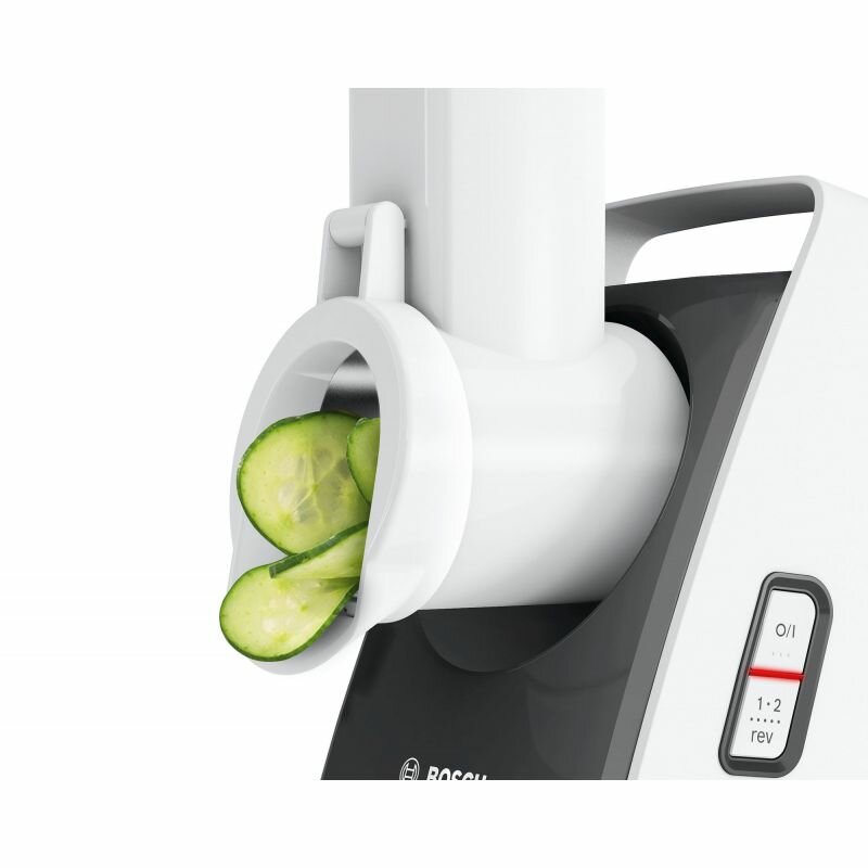 2 speeds, citrus press, mill; knife with double-sided sharpening; large loading tray with pusher; juice press; tray material: plastic; number of grater attachments: 3; number of shredding attachments: 1