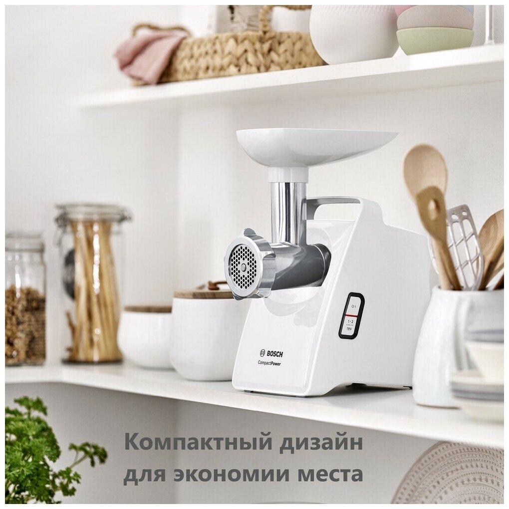 Rated power: 500 W, attachments: disk for minced meat, attachment for preparing sausages, meat grinder, body material: plastic, productivity: 2.30 kg/min, features: overload protection, compartment for storing attachments, p