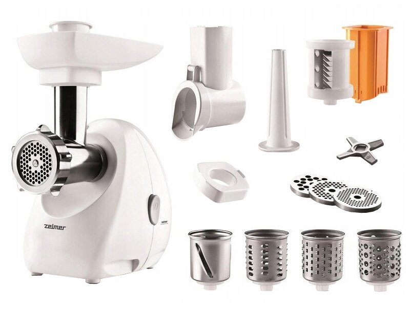 Nozzles: disk for minced meat, nozzle for preparing sausages, nozzle for shredding, nozzle-grater, body material: plastic, productivity: 2.50 kg/min, features: overload protection, dishwasher safe, p