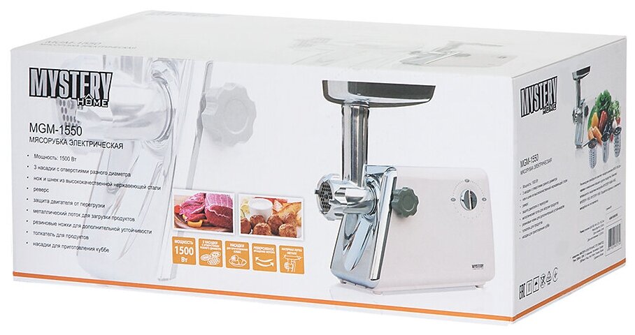 Rated power: 1500 W, attachments: mince disc, kebbe attachment, body material: plastic/metal, reverse system, features: overload protection, rubberized feet, number of perforated discs: 3