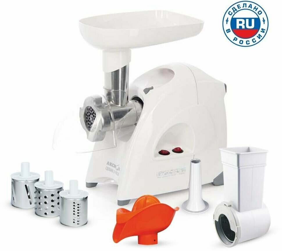 Rated power: 250 W, attachments: minced meat disc, shredding attachment, grater attachment, juicer, body material: plastic, reverse system, capacity: 2 kg/min, features: overload protection, washable