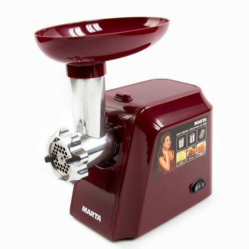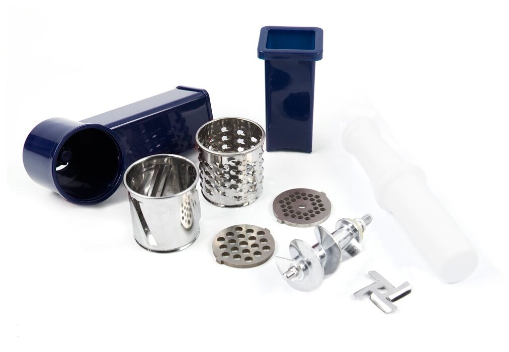 Rated power: 300 W, attachments: minced meat disc, shredding attachment, grater attachment, body material: plastic, reverse system, productivity: 2 kg/min, features: overload protection, rubberized legs,