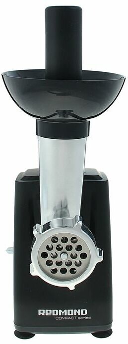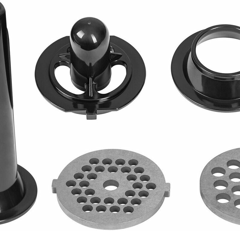 Pusher; carrying handle; equipment: loading tray, motor block, attachment for preparing sausages, meat grinder knife, base of the kebbe attachment, perforated discs for various types of minced meat 2 pcs., hands