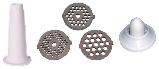 Nozzles: disk for minced meat, nozzle for kebbe, nozzle for preparing sausages, body material: plastic, reverse system, features: overload protection, rubberized feet, number of perforated disks: 3