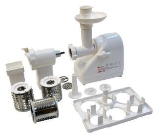Rated power: 220 W, attachments: disk for minced meat, attachment for cutting cookies, attachment for preparing sausages, attachment for shredding, body material: plastic, productivity: 0.60 kg/min, features: washable