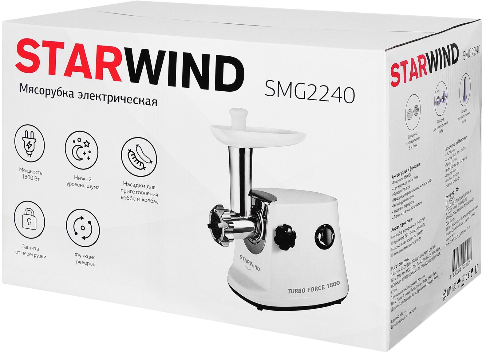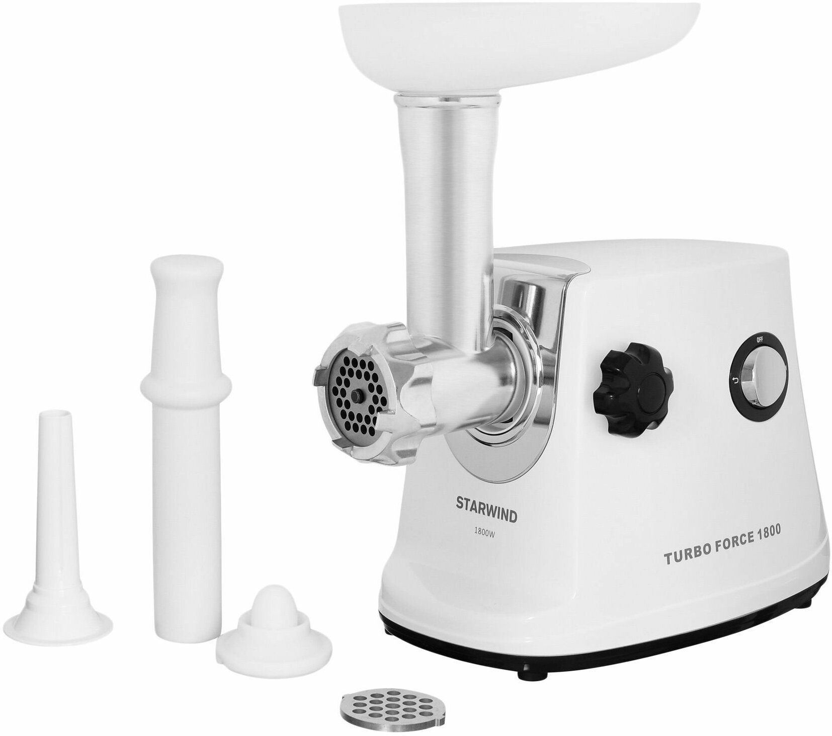 Nozzles: disk for minced meat, nozzle for kebbe, nozzle for preparing sausages, body material: plastic/metal, reverse system, features: overload protection, rubberized feet, self-sharpening knife, quantity