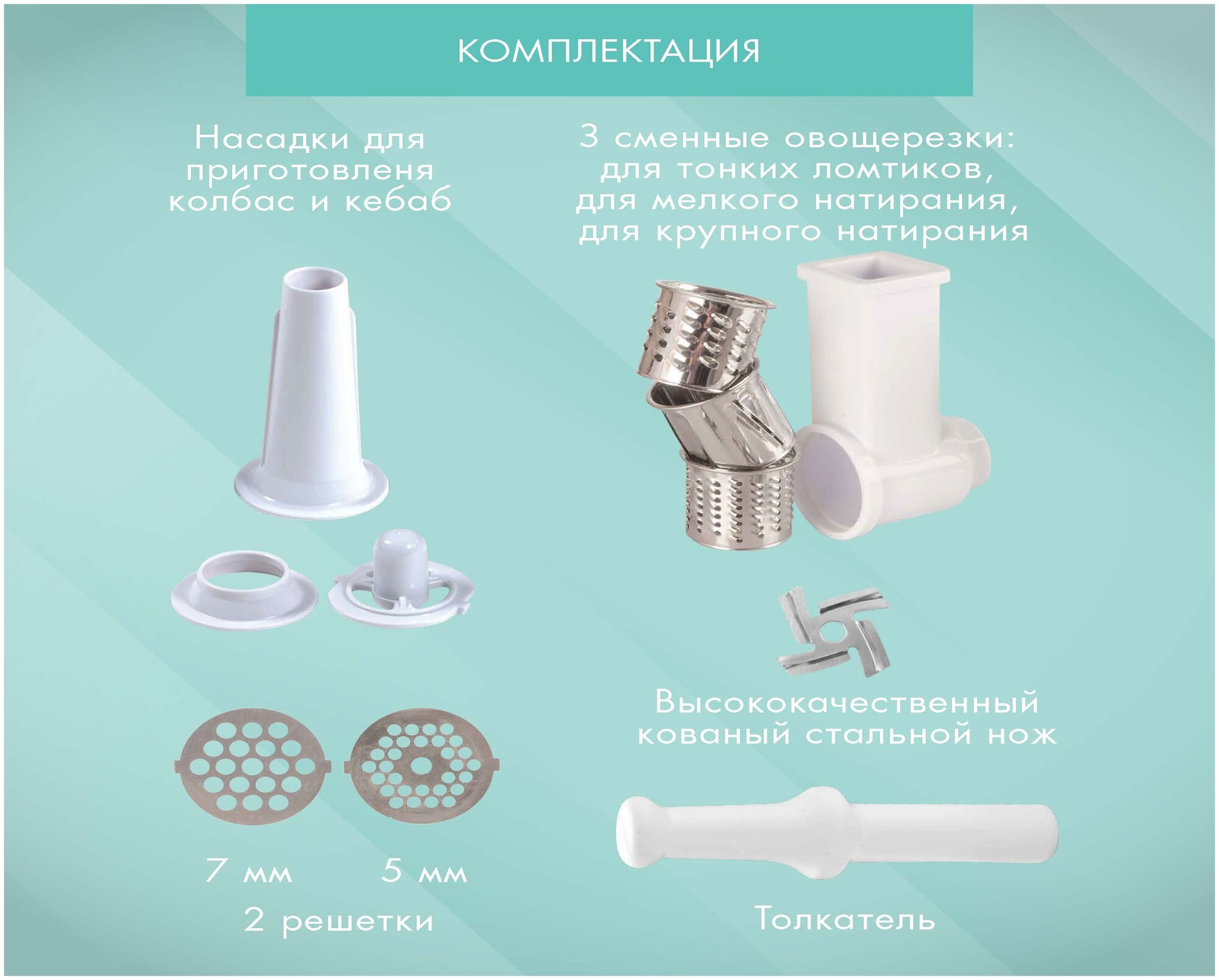 Scope of delivery: meat grinder; forged steel knife; 2 grilles: with 7 mm holes, with 5 mm holes; nozzles for preparing sausages and kebabs; pusher; 3 replaceable vegetable cutters: for thin slices, for fine grating, d