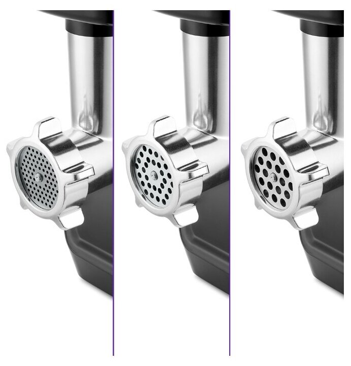 Contents 1. Meat grinder: • Housing with motor block - 1 pc. • Pusher — 1 pc. • Loading tray - 1 pc. • Loading block - 1 pc. • Auger - 1 pc. • Knife — 1 pc. • Grid with 3 mm holes - 1 pc. • Grill with holes