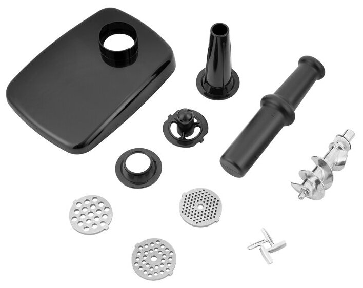 Additional Information: Contents 1. Meat grinder: • Housing with motor block - 1 pc. • Pusher — 1 pc. • Loading tray - 1 pc. • Loading block - 1 pc. • Auger - 1 pc. • Knife — 1 pc. • Grid with 3 mm holes - 1 pc. • Grill with holes