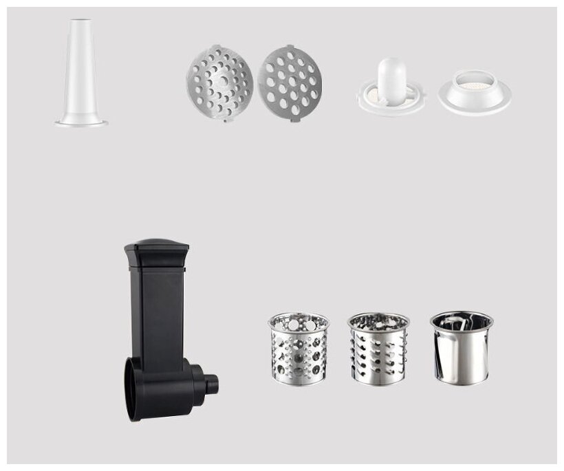 Mince disk, kebbe attachment, sausage attachment, shredder attachment, grater attachment