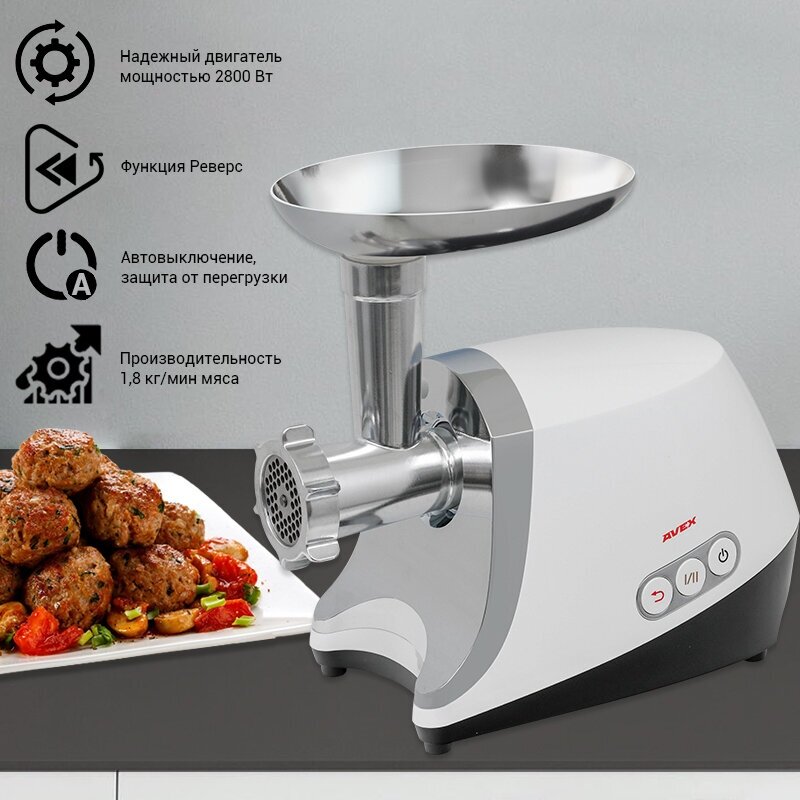 Rated power: 1000 W, attachments: mince disk, kebbe attachment, body material: plastic/metal, reverse system, productivity: 1.80 kg/min, features: overload protection, rubberized feet, maximum