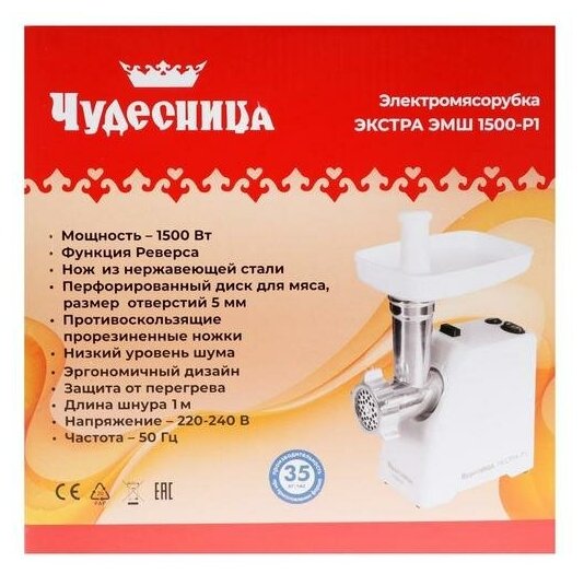 Rated power: 350 W, attachments: disk for minced meat, body material: plastic, reverse system, productivity: 0.60 kg/min, features: dishwasher safe, rubberized feet