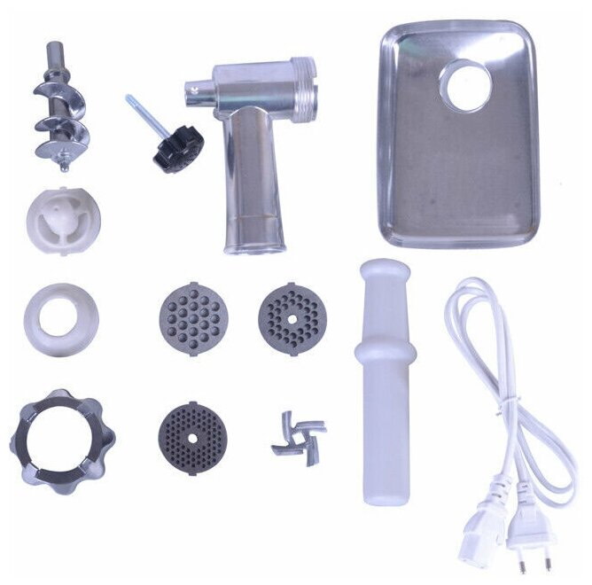 Rated power: 500 W, attachments: disk for minced meat, attachment for preparing sausages, body material: plastic, reverse system, features: overload protection, dishwasher safe, rubberized feet,
