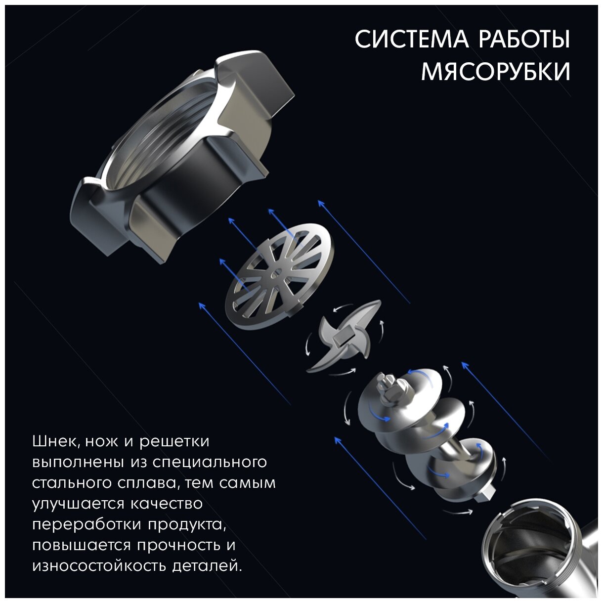 Metal gearbox; tray material: metal; maximum cookware height: 110 mm; number of attachments for preparing sausages: 2