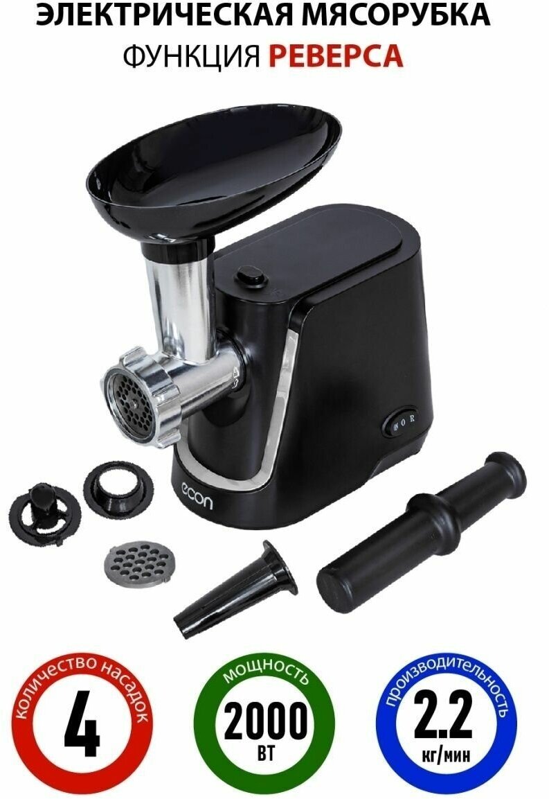 Description: Nozzles: disk for minced meat, nozzle for kebbe, nozzle for cooking sausages, 5 mm grid, 7 mm grid, nozzle for preparing sausages and kebbe, body material: plastic/metal, reverse system, capacity: 2.2