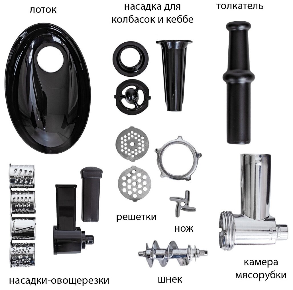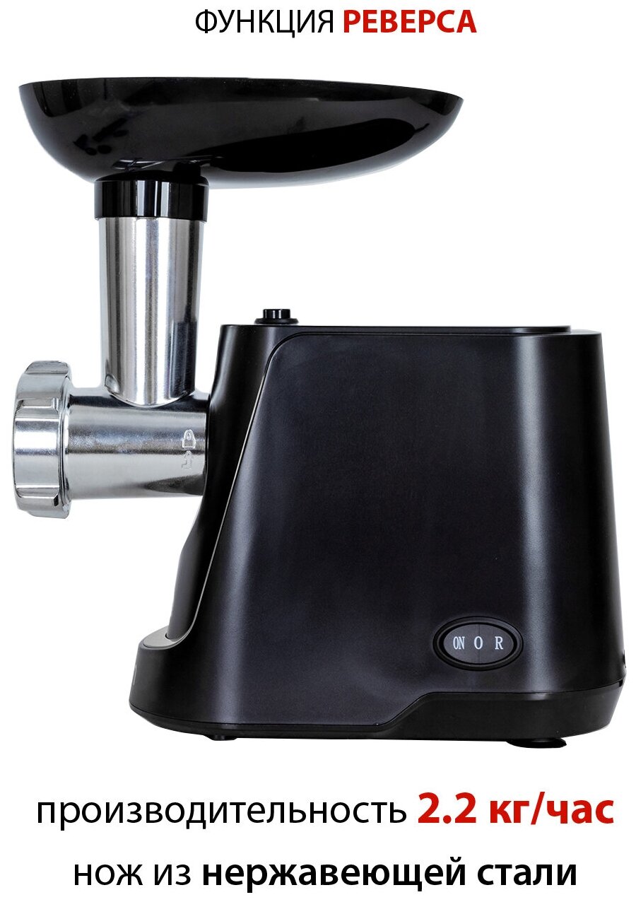 Nozzles: disk for minced meat, nozzle for kebbe, nozzle for preparing sausages, body material: plastic, reverse system, productivity: 2.20 kg/min, features: overload protection, rubberized feet, quantity