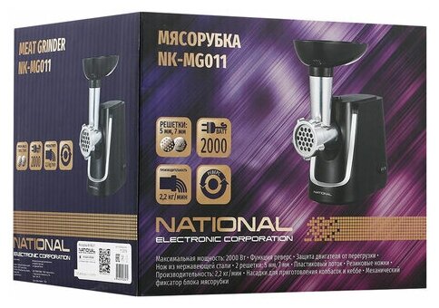 Nozzles: disk for minced meat, nozzle for kebbe, nozzle for preparing sausages, body material: plastic, reverse system, productivity: 2.20 kg/min, features: overload protection, dishwasher safe, etc.