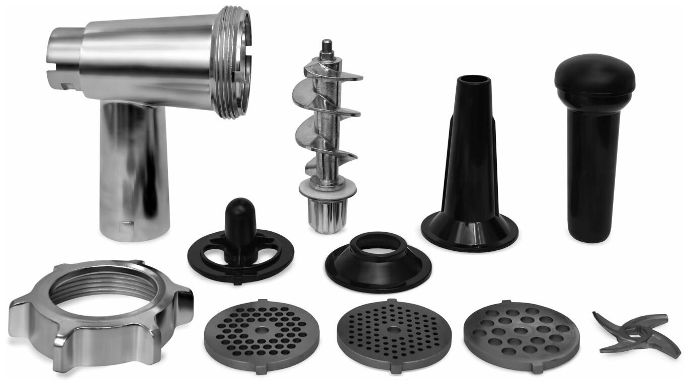 Nozzles: disk for minced meat, nozzle for kebbe, body material: metal, reverse system, features: overload protection, maximum continuous operation time: 20 minutes, number of perforated disks: 3