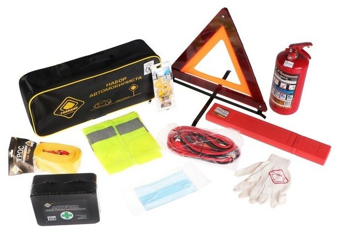 Powder fire extinguisher 2 kg, warning triangle, towing rope 2 t 5 m 2 hooks, first aid kit for cars, medical mask, gloves, starting wires 200A 2 m copper, bag 20 x 50 x 10 cm