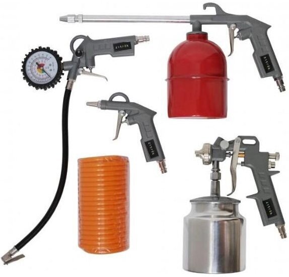 Set type: tools, tools in the set: spray gun, gun, maximum air flow: 120 l/min, air inlet diameter, inches: 1/4, connection type: bayonet, rapid, number of items in the set: 5 pcs.