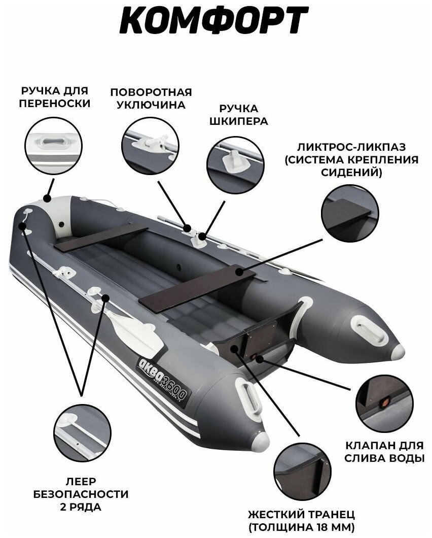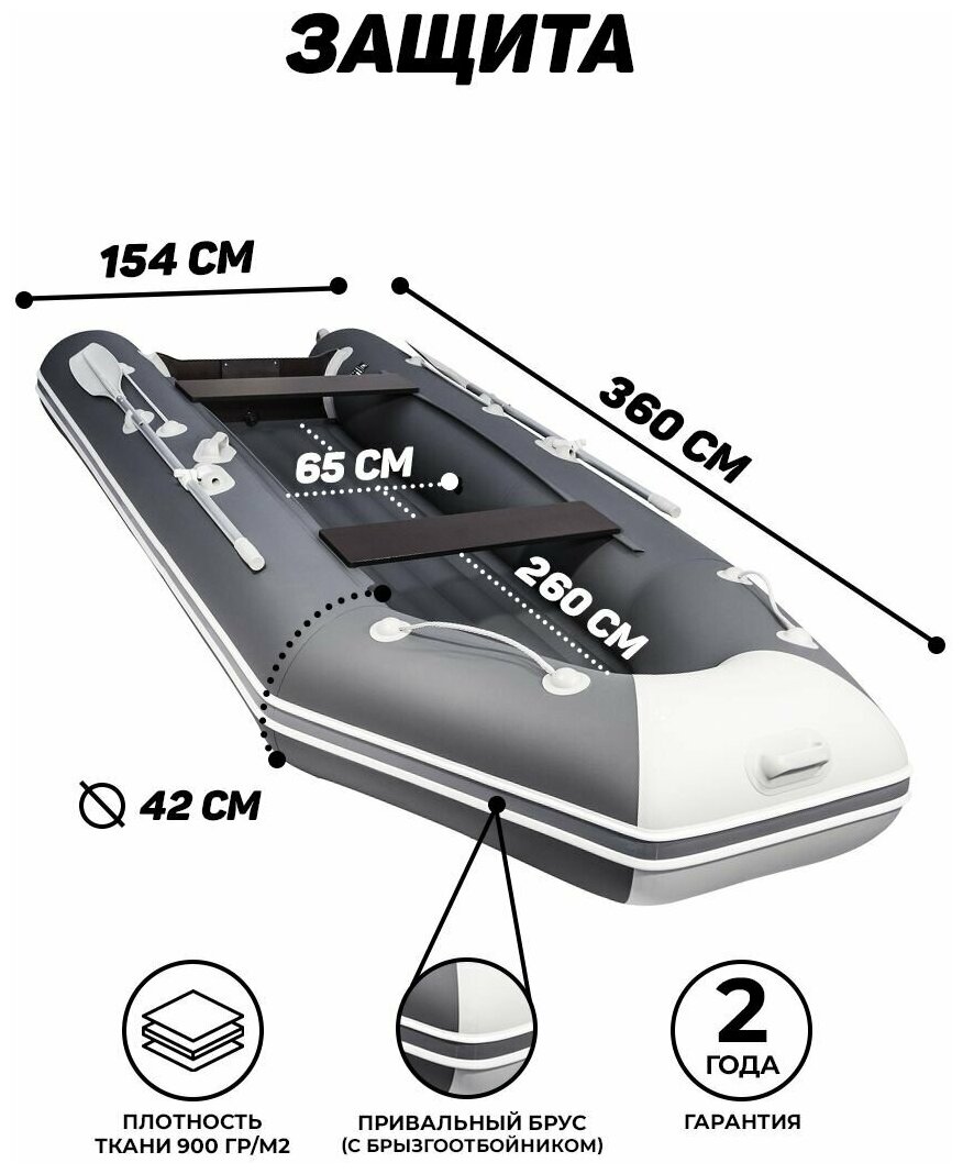 Type: motorized, number of seats: 3, bottom type: inflatable, floorboard type: inflatable, boat material: reinforced PVC, load capacity: 550 kg, boat length: 360 cm, boat width: 154 cm, weight: 34 kg, maximum motor power : 15 hp, trans