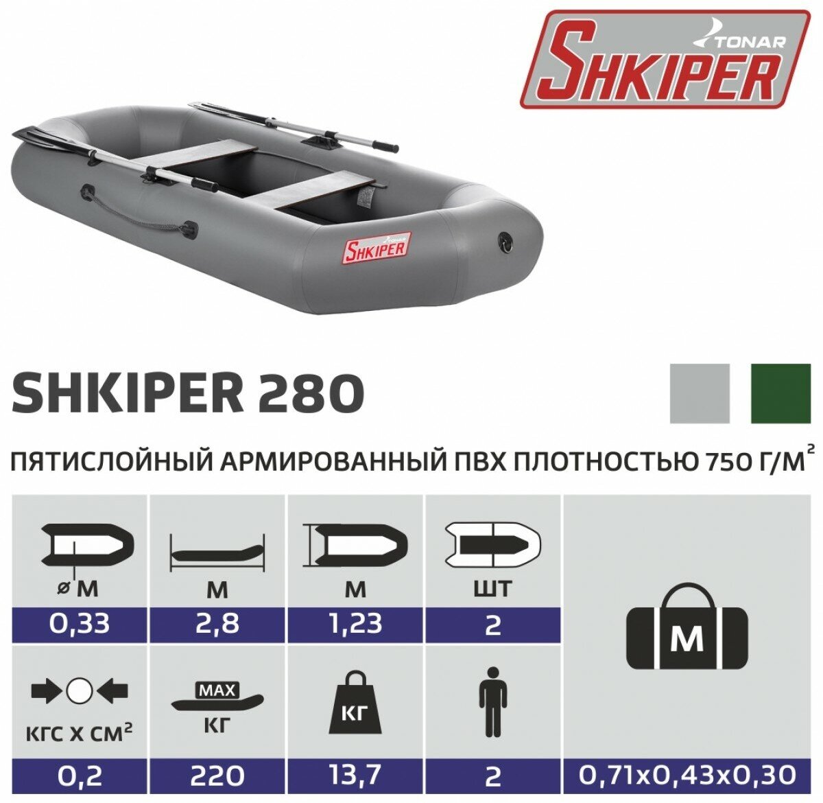 Type: rowing, number of seats: 2, bottom type: inflatable, load capacity: 220 kg, boat length: 280 cm, boat width: 123 cm, weight: 16.70 kg, transom: no