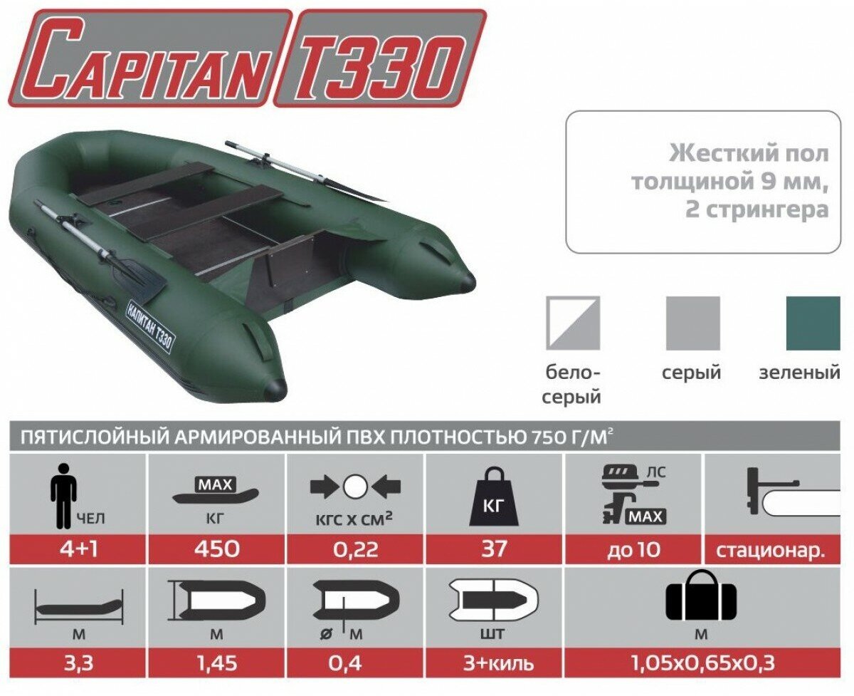 Type: motorized, number of seats: 4, bottom type: non-inflatable, floorboard type: solid, boat material: reinforced PVC, load capacity: 450 kg, boat length: 330 cm, boat width: 145 cm, weight: 37 kg, maximum motor power : 10 hp, tra